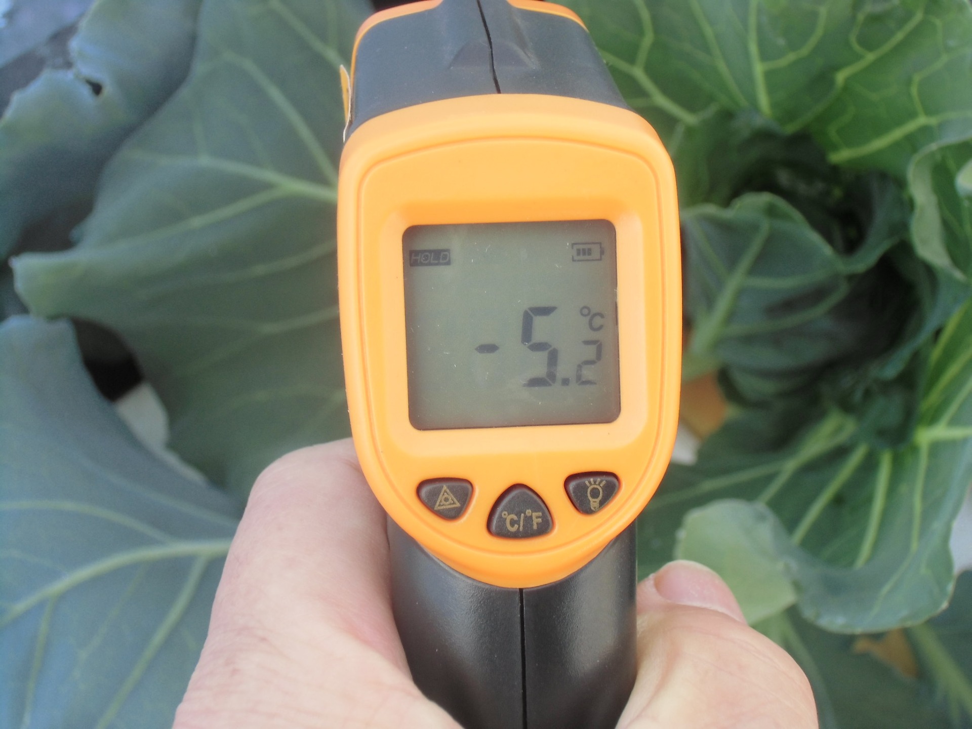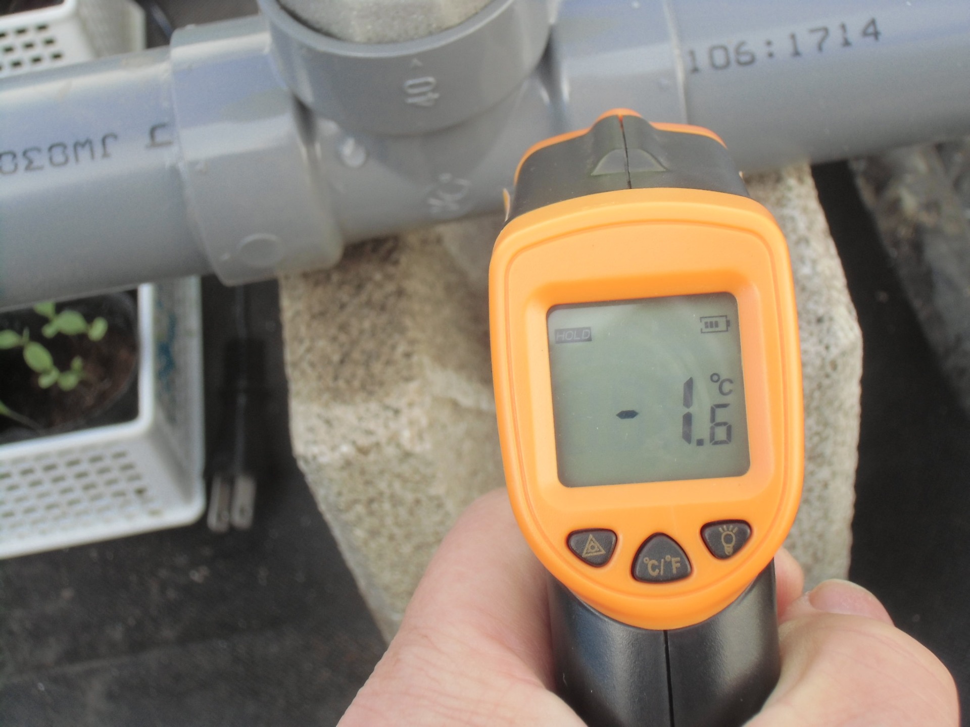 ついにこの冬一番の寒さになりました。水耕栽培のキャベツの表面温度が-5.2度になっていました。何か対策が必要です。パイプは-1.6度になっていました。