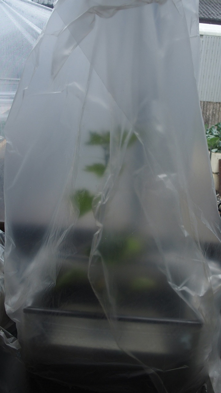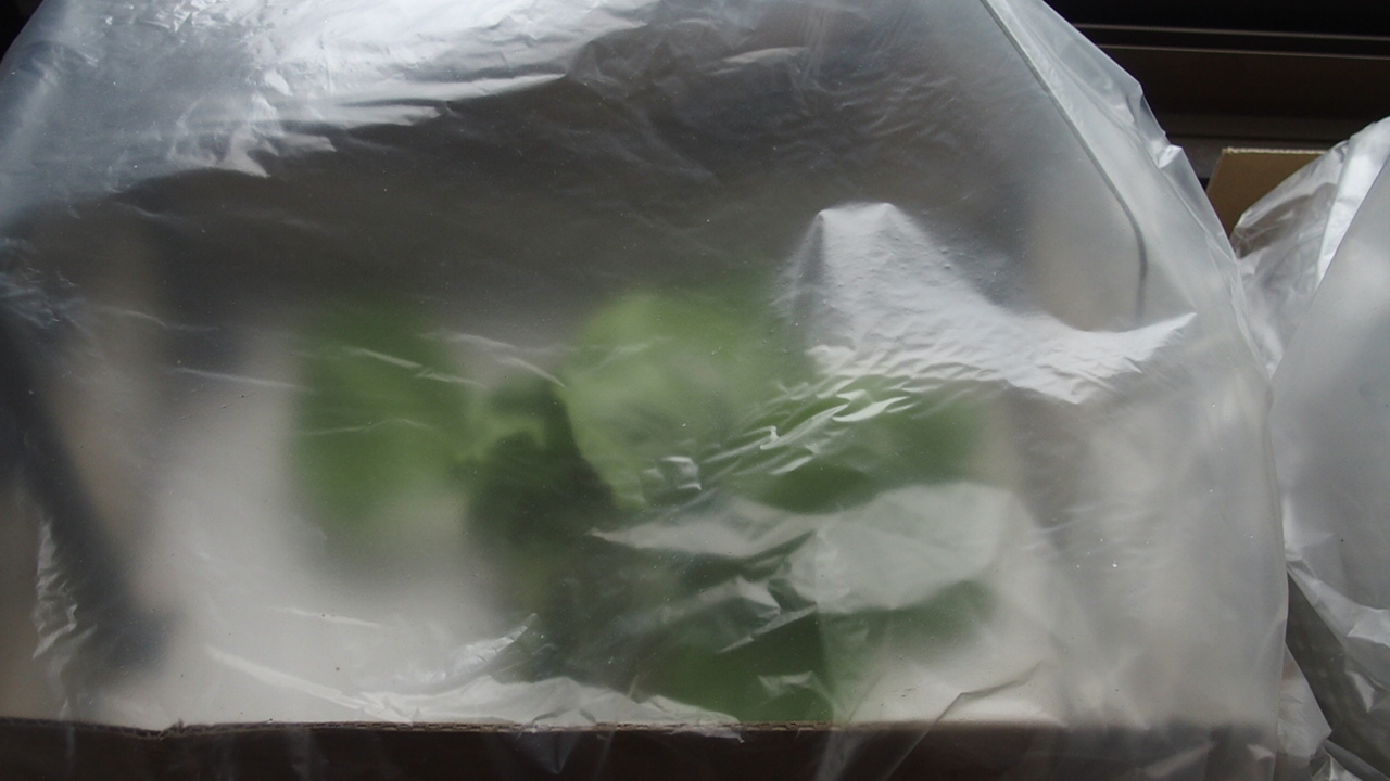 最近気温がグッと下がってきたので、キュウリとレタスに寒さ対策のビニールをかぶせました。水はヒーターにより22度くらいに保っているので、ビニール内は外よりも5度くらい高くなっています。