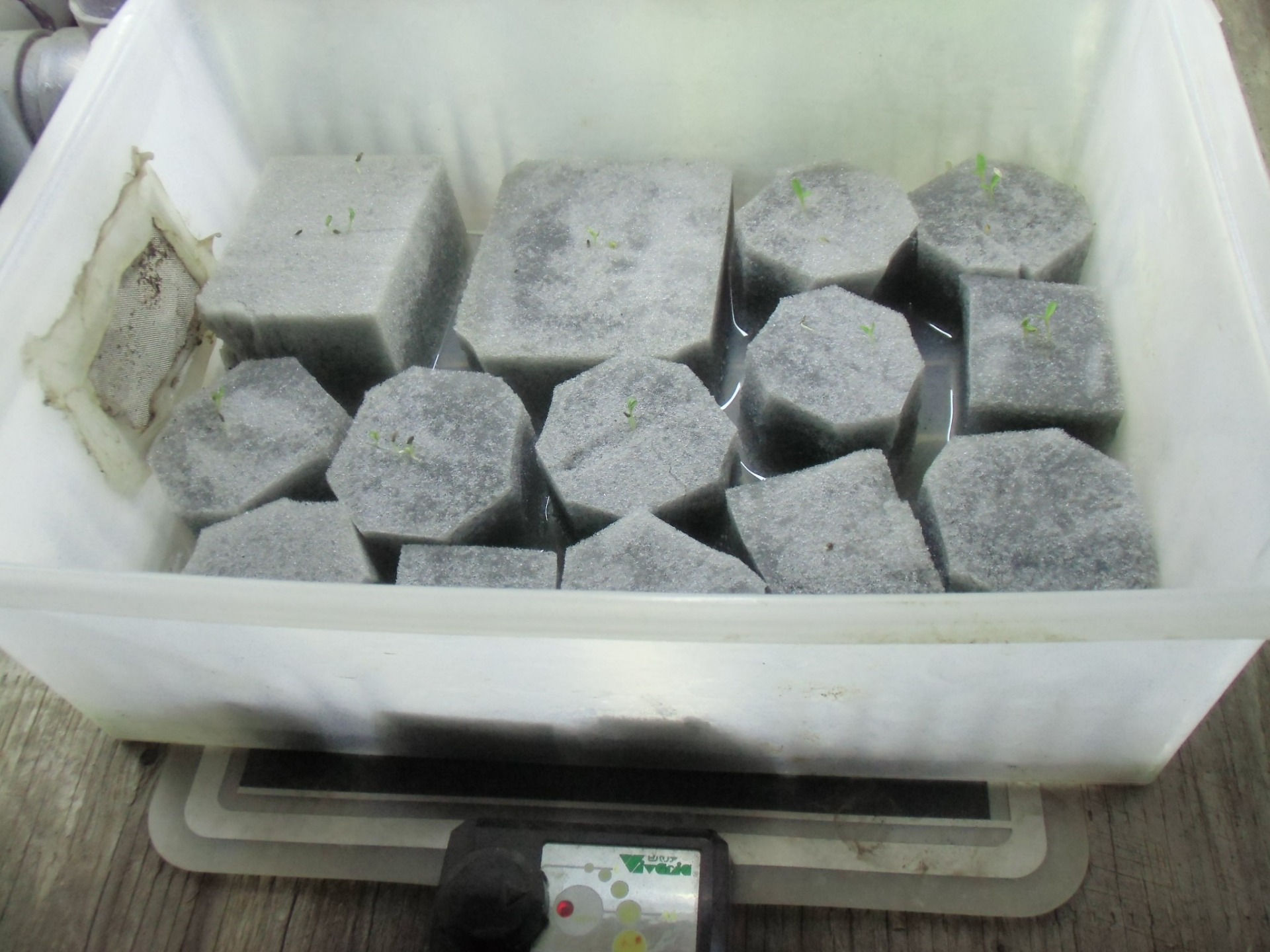 七日前、水耕栽培用にレタスやチンゲン菜の種をウレタンに播種しましたが、なかなか発芽しなかったため、ヒーターを使い温めたところ翌日には発芽が確認できました。ちょっと分かりずらいですが、ちゃんと発芽しています。使用したヒーターは両生類や小動物の保温用です。